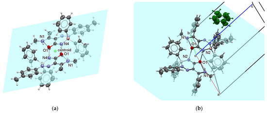 Triazaborinone 5c contains two types of hydrogen bonds. The first intramolecular bond is located between the N1 and O1 atoms. The other two intermolecular hydrogen bonds between N4 from the first molecule and O1 from the second molecule and vice versa bind the dimer-forming molecules. See Figure 11a for details. The plane passing through the atoms forming these intermolecular hydrogen bonds is shown in this Figure. The center of gravity of all dimer atoms is in the center of the hydrogen bond system. The point is marked as a centroid. The periodic arrangement of these basic dimers in the crystal is shown in Figures S125–S127 in the Supplementary Material. The view in the direction of the crystallographic axis a and c, and the reciprocal cell axis b* is shown. The conjugate system of three double bonds (between O1 and C1, C2 and N2, and N1 and C3 in one molecule) lies in a plane. The analogous plane from the second molecule of the dimer is parallel to the first plane and is shifted by 0.128 Å, as can be seen in Figure S128. Thus, all of these double bonds in the dimer lie practically in the plane. These bonds were assigned as doubles on the basis of their lengths, and the fact that they lie in a plane supports the indicated structure with a lower application of conjugation between the triazaborinone ring and the aromatic ring. The aromatic benzene rings are deflected out of these planes as well as boron atoms.