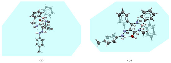 Oxazaborine 6a, which was previously prepared from 3-aminobut-2-ennitrile as the starting compound, was characterized in our previous publication [30]. Unlike our earlier publication, the prepared single crystal 6a was now measured at room temperature. The structure obtained is identical, and the newly estimated values are given in Table S5. The new parameters slightly differ from those previously published due to the measurement temperature, and the resulting statistics are slightly better. Unlike other prepared single crystals at this work, only oxazaborine 6a needs two molecules to form an asymmetric unit (see Figure 12b or Figure S132). In addition, in the case of this substance, three conjugated double bonds lie in the plane. They are N3N4, C1C2, and C3N2. In this case, the boron atoms are completely deflected out of these planes, and the N–B–O angles are 103.69° and 104.13°. Sizes of such angles are not common but are described in the literature.
