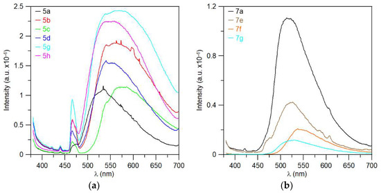 Fluorescence spectrum: (a) triazaborines 5a–d, 5g, and 5h; and (b) diazaborinones 7a, 7f–g.