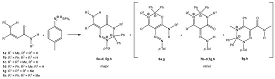 Possible products of the reaction of enaminoamides 1a–h with 4-methylbenzenediazonium tetraphenylborate.