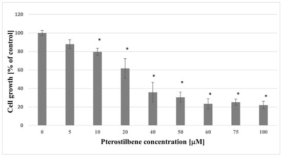 Growth inhibitory effect of pterostilbene on HT-29 cells after 48 h of treatment. The results are expressed as a percentage of untreated control (the means ± SD; * p < 0.05 vs. control).