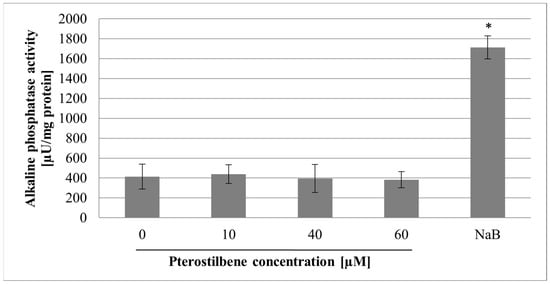 Effect of pterostilbene (10–60 µM) and sodium butyrate (NaB) (1 mM) on alkaline phosphatase (ALP) activity after 72 h of treatment. Results are presented as mean ± SD; * p < 0.05 vs. control.
