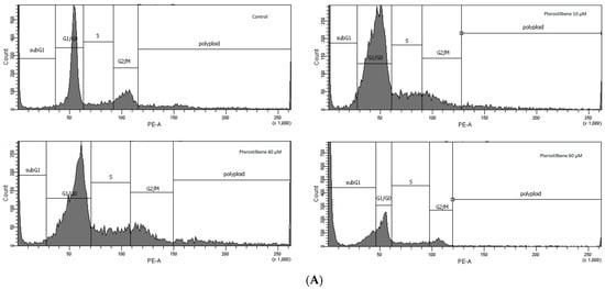 To study the cell cycle distribution, HT-29 cells were seeded at a density of 1 × 105 cells onto 21.5 cm2 and allowed to attach and grow for 24 h. Cell cultures were then exposed to various concentrations (0, 10, 40, and 60 µM) of pterostilbene. After 48 h, cells were trypsinized, washed twice in ice-cold PBS buffer, and fixed in 70% ice-cold ethanol while vortexing at low speed. The samples were stored at −20 °C overnight. Directly before the assay, cells were incubated with RNase A (final concentration, 200 µg/mL) in PBS buffer for 1 h at 37 °C in the dark and then stained with propidium iodide solution (Sigma-Aldrich, final concentration, 10 µg/mL). The DNA content and cell cycle distribution of the cells were analyzed by BD FACS Aria II flow cytometer and BD FACSDiva software (BD Biosciences, San Jose, CA, USA).