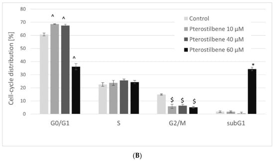 Based on our results and published studies, further studies focused on pterostilbene at concentrations 10, 40, and 60 µM. Flow cytometric cell cycle analysis indicated that pterostilbene at all concentrations used reduced the G2/M population of HT-29 cells. Treatment with pterostilbene at lower concentrations induced an increase in the G0/G1 phase, indicating that it delayed the progression of the cell cycle in HT-29. The highest concentration of pterostilbene increased the cell population in sub-G1 cells. Therefore, these results indicate the dose-dependent ability of pterostilbene to induction of HT-29 cell cycle arrest and apoptotic cell death.