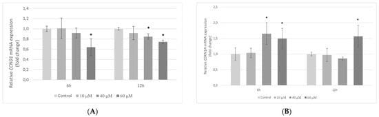 Expression of (A) CCND1; (B) CDKN1A genes in HT-29 cells after treatment with 10, 40, and 60 µM pterostilbene for 6 h and 12 h. The results are presented as mean ± SD; * p < 0.05 vs. control.