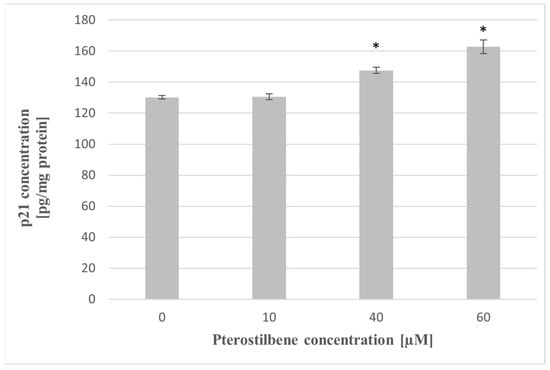Effect of pterostilbene on p21 concentration in HT-29 cells after 24 h of incubation. The results are presented as mean ± SD; * p < 0.05 vs. control.