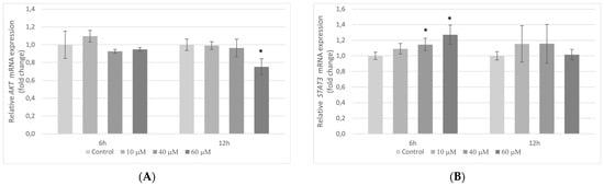 Effect of pterostilbene on the expression of (A) AKT and (B) STAT3 genes in HT-29 cells after treatment with 10, 40, and 60 µM pterostilbene for 6 h and 12 h. The results are presented as mean ± SD; * p < 0.05 vs. control.