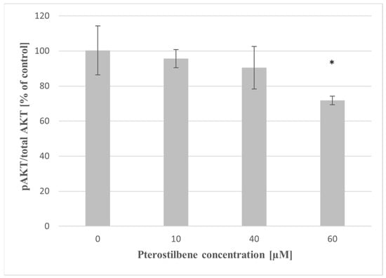 The influence of pterostilbene on AKT activity in HT-29 at 24 h. The results are presented as mean ± SD; * p < 0.05 vs. control.