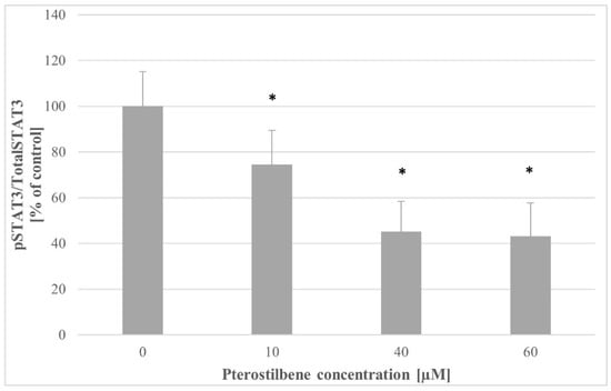 To evaluate whether the STAT3 pathway could be changed with pterostilbene treatment, the p-STAT3/total STAT3 ratio was determined in control cells and cells incubated with pterostilbene. As shown in Figure 9, pterostilbene at all concentrations used caused an essential down-regulation of STAT3 in HT-29 cells compared to the control. There were no significant differences between STAT3 activity in cultures treated with 40 and 60 µM pterostilbene.