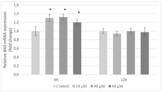 Expression of the BAX gene in HT-29 cells after treatment with 10, 40, and 60 µM pterostilbene for 12 and 24 h. The results are presented as mean ± SD; * p < 0.05 vs. control.