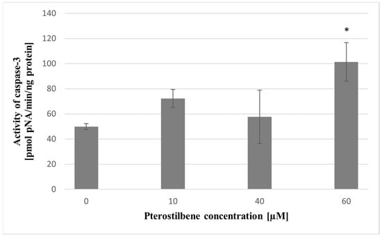 Effect of pterostilbene at concentrations of 10, 40, and 60 µM on caspase-3 activity in HT-29 cells at 48 h. The results are presented as mean ± SD; * p < 0.05 vs. control.