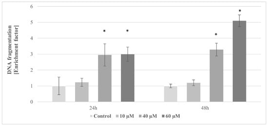 The specific enrichment of mononucleosomes and oligonucleosomes released into the cytoplasm of the cells treated with pterostilbene at concentrations of 10, 40, and 60 µM for 24 and 48 h. The results are presented as mean ± SD; * p < 0.05 vs. control.