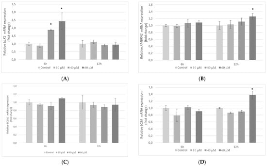 Expression of the (A) ULK1, (B) AMBR1, (C) BCLN1, and (D) LC3A genes in HT-29 cells after treatment with pterostilbene for 6 and 12 h. The results are presented as mean ± SD; * p < 0.05 vs. control.