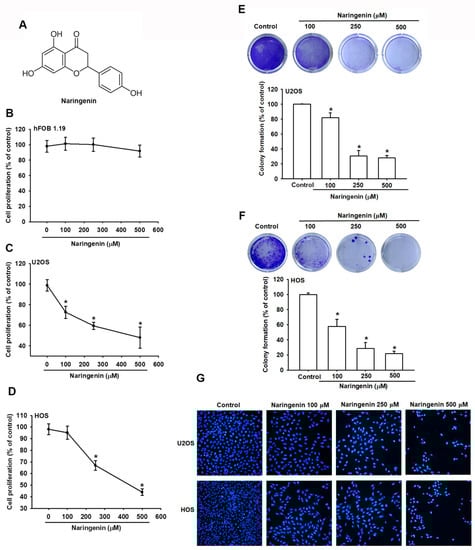 Naringenin inhibits the proliferation of human osteosarcoma cells. (A) Structure of naringenin. (B–D) hFOB 1.19, HOS, and U2OS cells were treated with the indicated concentration of naringenin for 24 h, and cell proliferation was determined using the CCK-8 assay. (E,F) Colony formation assay was performed in HOS and U2OS cells treated with naringenin at various concentrations (100, 250, and 500 μM) for 7 days. Quantitative results indicated the number of colonies per group. (G) After cells were incubated with various concentrations of naringenin for 24 h, the nucleus morphology was determined through 4′,6-diamidino-2-phenylindole staining, and cells were photographed. Magnification, ×200. Results are expressed as the mean ± SD of four independent experiments. * p < 0.05 compared with control.