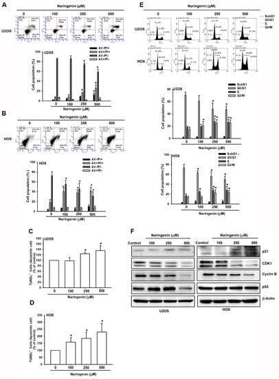 Naringenin induced apoptosis and cell cycle arrest at the G2/M phase in human osteosarcoma cells. (A–D) Cells were treated with naringenin at various concentrations (100, 250, and 500 μM) for 24 h. Apoptotic cells were determined using with Annexin V/PI and TUNEL staining. (E) Flow cytometry was performed to determine the cell cycle distribution of HOS and U2OS cells treated with naringenin at various concentrations (100, 250, and 500 μM) for 8 h. (F) Levels of p21, CDK1, cyclin B, and p53 proteins in naringenin-treated cells for 8 h were detected through western blotting. Results are expressed as the mean ± SD of four independent experiments. * p < 0.05 compared with control.