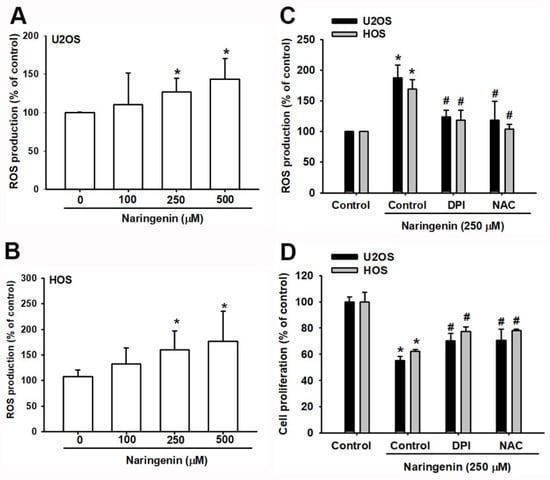 Naringenin induces reactive oxygen species (ROS) generation in human osteosarcoma cells. (A,B) Cells were treated with naringenin (100, 250, and 500 μM) for 1 h and stained with H2DCFDA. The percentage of ROS production was determined by flow cytometry. (C) Cells were treated as described in A-B. ROS inhibitors inhibited ROS production. (D) After cells were pretreated with a ROS inhibitor for 1 h, followed by stimulation with naringenin for 24 h, cell viability was examined by using the CCK-8 assay. Results are expressed as the mean ± SD of three independent experiments. * p < 0.05 compared with the control group; # p < 0.05 compared with the naringenin-treated group.