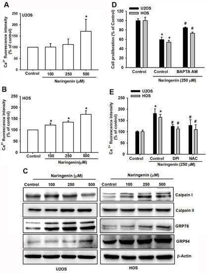 Naringenin triggers Ca2+ release and causes endoplasmic reticulum (ER) stress in human osteosarcoma cells. (A,B) Cells were treated with naringenin (100, 250 and 500 μM) for 5 h and stained with Fluo-4 AM. Ca2+ expression was examined by using flow cytometry. (C) After cells were treated with varying concentrations of naringenin for 8 h, the protein expression of GRP78, GRP94, calpain I, and calpain II was examined using with western blotting, and β-actin was used as the internal control. (D) After cells were pretreated with BAPTA-AM for 1 h, followed by stimulation with naringenin for 24 h, cell viability was examined using the CCK-8 assay. (E) After cells were pretreated with a ROS inhibitor for 1 h, followed by stimulation with naringenin for 5 h, Ca2+ expression was examined by using flow cytometry. Results are expressed as the mean ± SD of four independent experiments. * p < 0.05 compared with the control group. # p < 0.05 compared with the naringenin-treated group.