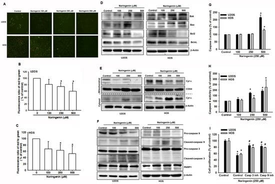 ROS production and accumulation in mitochondria reduce MMP, thereby triggering the mitochondrial apoptotic pathway []. To examine the effect of naringenin on HOS and U2OS cells, JC-1 staining was performed to determine the fluorescence ratio of orange and green fluorescence between normal and unhealthy mitochondria. Orange fluorescence disappeared in cells when observed under the 200× microscope, indicating mitochondrial dysfunction (Figure 5A). To verify the loss of MMP, HOS and U2OS cells were analyzed using with flow cytometry, and the results revealed a shift in MMP in naringenin-treated cells (Figure 5B,C). The findings indicated the loss of MMP in cells treated with various naringenin concentrations. Mitochondrial and cytosolic proteins, cytochrome c, and proapoptotic/antiapoptotic proteins were examined in cells treated with naringenin. The release of cytochrome c due to mitochondrial dysfunction was upregulated by protein–protein interactions between Bcl-2 proteins (Figure 5D,E). Proapoptotic proteins, Bak and Bax, and cytochrome c released in the cytosol were upregulated with the increasing concentration of naringenin (Figure 5D,E). In the mitochondrial pathway of apoptosis, the downstream signaling of caspases was activated after treatment with naringenin. To determine the primary mediators of apoptosis, caspase-3 and caspase-9 were examined in naringenin-treated HOS and U2OS cells. The results revealed the upregulation of caspases, including that of the PARP cleavage (Figure 5F). To determine the intrinsic pathway of naringenin-induced apoptosis, caspase-3 and caspase-9 activities were examined separately (Figure 5G,H). The activities of both caspases were associated with naringenin-induced cell apoptosis. Pretreatment of cells with a caspase-3 inhibitor (z-DEVD-FMK) or caspase-9 inhibitor (z-LEHD-FMK) inhibited naringenin-induced cell apoptosis (Figure 5I). Thus, these data demonstrated that naringenin induced mitochondrial dysfunction and the subsequent release of cytochrome c and activation of caspases-9 and caspases-3 in human osteosarcoma cells.