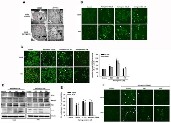 Because cell autophagy regulates cell death, we examined whether naringenin can induce autophagy. The autophagy phenomenon was observed in HOS and U2OS cells treated with naringenin. Using a transmission electronic microscope, it was observed that naringenin induced the formation of numerous intracytoplasmic vacuoles in HOS cells (Figure 6A). In addition, to observe naringenin-induced autophagy, HOS and U2OS cells were stained with DAPgreen, and the green fluorescence intensity within cells was detected. The intensity increased with the concentration of naringenin (Figure 6B). Moreover, AO staining revealed the accumulation of acidic vesicles in HOS and U2OS cells (Figure 6C). Furthermore, we examined the expression of several proteins that serve as markers of autophagy. Naringenin increased the level of microtubule-associated protein light chain 3 (LC3)-II and the expression of ATG5, Beclin 1, and p62 in a dose-dependent manner (Figure 6D). To determine the role of autophagy in naringenin-induced cell death, siRNAs of Beclin 1 and ATG5 were transfected in HOS and U2OS cells. The results of the CCK-8 assay revealed that Beclin 1 and ATG5 siRNAs suppressed the naringenin-induced loss of cell viability (Figure 6E), indicating that the autophagic mechanism of ATG5 and Beclin 1 involved in naringenin-induced cell death promotes either survival or death and is associated with signaling transduction in programmed cell apoptosis. Furthermore, we examined naringenin-induced cell autophagy by using ROS inhibitors. We performed DAPgreen staining to observe the green fluorescence intensity (Figure 6F). Cell images were obtained using a fluorescence microscope, and it was observed that after adding the inhibitors, the autophagosome (white arrow) significantly decreased in naringenin-treated cells compared with control cells. The results indicate that naringenin-induced intracellular ROS production triggered autophagic signaling in human osteosarcoma cells.