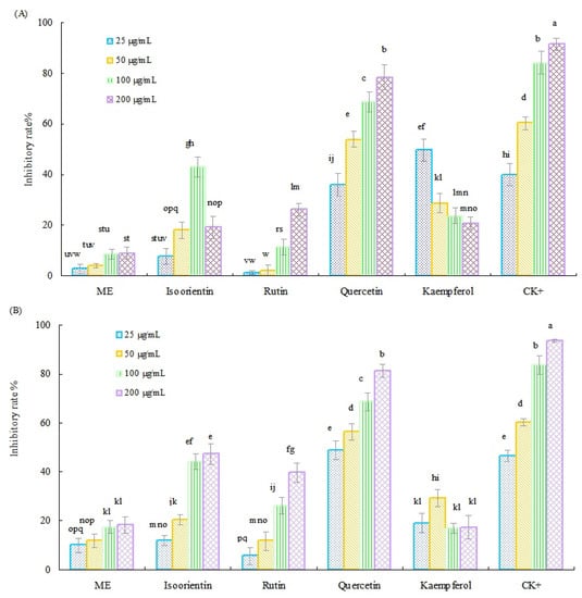 Inhibitory activity of ME of Tartary buckwheat sprouts and four flavonoids against the spore germination of F. oxysporum f. sp. vasinfectum (A) and F. oxysporum f. sp. cucumerinum (B). CK+ was carbendazim. Different letters (i.e., a–q) in each column indicated significant differences among the treatment at p = 0.05 level.