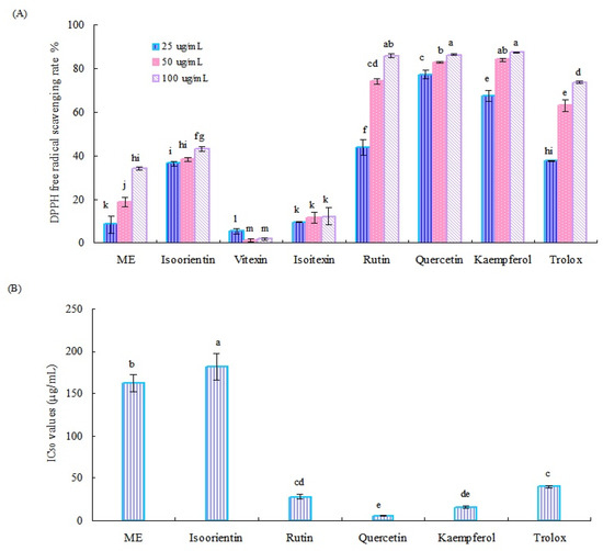 DPPH radical scavenging rate (A) and IC50 values (B) of the methanol extract of Tartary buckwheat sprouts and six main flavonoids. Different letters (i.e., a–m) in each column indicated significant differences among the treatment samples, at p = 0.05 level.
