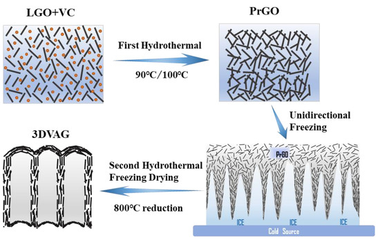The preparation methods of 3DVAG mainly include the directional freezing method [21,22,23,24], plasma−enhanced chemical vapor deposition (CVD) method [25,26,27,28,29], and KOH−assisted hydrothermal method [30,31,32]. The bulk density of 3DVAG prepared by the KOH−assisted hydrothermal method is low, and it has limitations when loading active substances. This can only be compounded by subsequent in situ loading. The CVD method can be used to prepare high−quality 3DVAG with microscopic vertical channels, but it requires high temperature and high vacuum. The directional freezing method uses simple ice crystal templates to assemble graphene oxide (GO) flakes to obtain micron−scale vertically ordered graphene arrays with good orderliness, whose pore sizes and wall thicknesses can be controlled by adjusting certain processing parameters. The formation of vertical porous structures by the directional freezing method is affected by the complex dynamic liquid–particle and particle–particle interactions. During directional freezing, graphene oxides with a large size of area (LGO) are superior in promoting the formation of a good vertical porous structure, which has low interlayer contact resistance, good stress transfer efficiency, and excellent mechanical and electrical properties [33].