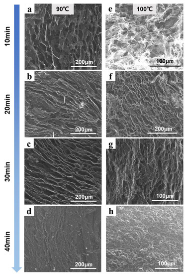 Effect of hydrothermal temperature and reduction time on the microstructure of graphene gel. (a) hydrothermal reduction at 90 °C for 10 min; (b) hydrothermal reduction at 90 °C for 20 min; (c) hydrothermal reduction at 90 °C for 30 min; (d) hydrothermal reduction at 90 °C for 40 min; (e) hydrothermal reduction at 100 °C for 10 min;(f) hydrothermal reduction at 100 °C for 20 min; (g) hydrothermal reduction at 100 °C for 30 min; (h) hydrothermal reduction at 100 °C for 40 min.