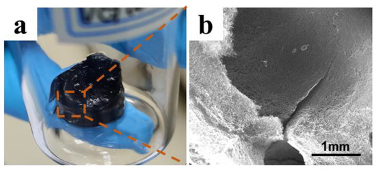 From the above results, it can be found that the directional structure appeared at both 90 °C and 100 °C oil bath temperatures. Compared with other times, the vertical structure of the gel obtained by hydrothermal treatment for 30 min at 90 °C was more obvious. However, when the temperature was 100 °C, a similar structure could be obtained merely by reduction for 20 min, indicating that a higher temperature reduced the partial reduction time required. In addition, a higher hydrothermal temperature led to more obvious shrinkage of the gel volume. In the actual preparation process, the hydrothermal reduction reaction at 100 °C was fast, and a large number of oxygen−containing functional groups were decomposed into gas. Because the solvent of the GO suspension is water, it evaporates quickly at high temperature, which leads to pores forming in the gel, as shown in Figure 5. The inner surface of the pores was smooth and flat, which blocked the growth of ice crystals during the unidirectional freezing process; the resulting gel structure had low mechanical strength and was prone to breakage. Therefore, the 100 °C oil bath was not used for hydrothermal reduction in subsequent studies.
