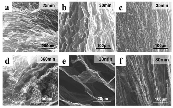 The micromorphology of graphene gel prepared in diffident conditions: (a) hydrothermal reduction of 25 min; (b) hydrothermal reduction of 30 min; (c) hydrothermal reduction of 35 min; (d) hydrothermal reduction of 360 min; (e) cross section of VAG90−30; (f) longitudinal section of VAG90−30.