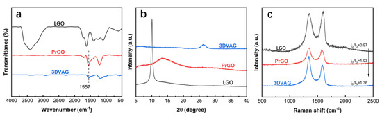 In order to evaluate the hydrothermal reduction and thermal reduction of VAG90−30 graphene gel, the samples were tested by FTIR spectroscopy, XRD, and Raman spectroscopy. In Figure 7a, it can be found that, after ascorbic acid reduction and heat treatment at 800 °C, the absorption peaks of oxygen−containing groups at 1735, 1630, 1254, and 1076 cm−1 were significantly weakened. In addition, a new broad peak appeared at 1557 cm−1, related to stretching vibration of the C=C bond in the reduced graphene oxide [34], indicating that LGO was successfully reduced. It can also be found from the XRD image (Figure 7b) that, as the degree of reduction increased, the (002) diffraction peak at 2θ = 26.3° finally appeared in 3DVAG. According to the Bragg equation, a graphene layer spacing of d = 0.336 nm inside 3DVAG was calculated, indicating that the reduction degree of 3DVAG was high. The Raman characterization and analysis of the defects of the graphene sheet during the reduction process are shown in Figure 7c. LGO, PrGO, and 3DVAG all had obvious absorption peaks at 1347 cm−1 (D peak) and 1596 cm−1 (G peak). After reduction, the ID/IG ratios of PrGO and 3DVAG were 1.03 and 1.36, respectively. The increase in ID/IG indicates that, during the reduction process, the releases of gas during the decomposition of oxygen−containing functional groups destroyed the integrity of the flake, resulting in an increase in defects and disorder of graphene.