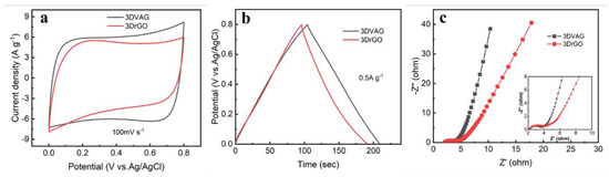 Electrochemical performance of 3DVAG and 3DrGO in a three−electrode system: (a) CV; (b) GCD; (c) EIS.
