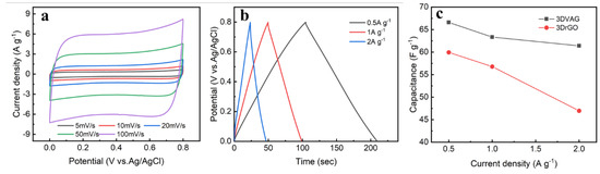 Figure 9a shows the CV curve of 3DVAG material at a scan rate of 5−100 mV·s−1. At different scan speeds, the CV curve could maintain a good rectangular shape, indicating good magnification performance. From the GCD curve shown in Figure 9b, it can also be found that the curves showed symmetry at different current densities. According to the specific capacitance calculation formula, it can be concluded that, as the current density increased, the specific capacitance did not have a large attenuation. The current density increased from 0.5 to 2 A·g−1, the specific capacitance decreased from 66.6 F·g−1 to 61.4 F·g−1, and the capacitance retention rate reached 92.2%. However, the conventional graphene gel 3DrGO showed poor rate performance (Figure 9c) at a high current density of 2 A·g−1, while its specific capacitance was only 78.4% at 0.5 A·g−1. This result shows that 3DVAG had excellent rate performance.