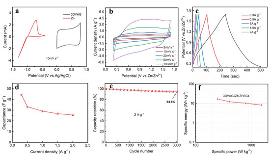 As shown in Figure 10a, a carbon−based aqueous zinc−ion hybrid supercapacitor was constructed using zinc flakes as the negative electrode, 3DVAG material as the positive electrode, and 2 M ZnSO4 aqueous solution as the electrolyte. Figure 10b shows the CV curve of the ZHSCs at a scan rate of 5 to 100 mV·s−1 and a voltage window of 0.2 to 1.7 V. Its shape was rectangular, showing that the 3DVAG positive electrode stored zinc ions through the pore absorption/desorption reaction, and the negative electrode featured the deposition/dissolution reaction of zinc ions on the surface of the zinc sheet. With the gradual increase in scanning speed, the CV response current and the area became gradually larger, and the shape did not undergo obvious deformation. Figure 10c shows the GCD curve of ZHSCs at different current densities of 0.3−2 A·g−1. The curve showed a certain voltage plateau, corresponding to the redox peak in the CV curve, thus exhibiting good zinc−ion storage performance. Through calculation, the mass specific capacitances at current densities of 0.3, 0.5, 1, 1.5, and 2 A·g−1 were 44.4, 33.2, 29.1, 26.7, and 25.5 F·g−1, respectively, showing a good rate performance (Figure 10d). In addition, the ZHSCs also showed excellent cycle stability, whereby the capacitance retention rate reached 94.6% (Figure 10e) after 3000 cycles of charge and discharge at a current density of 2 A·g−1. Figure 10f shows the Ragone diagram of 3DVAG//Zn ZHSCs, it can be found that the 3DVAG electrode exhibited high energy and power density. At a power density of 249.3 W·kg−1, its energy density could reach 17.03 W·h·kg−1; at a high power density of 1528 W·kg−1, its energy density could reach 8.28 W·h·kg−1, which is higher than some previously reported carbon−based supercapacitors [39,40].