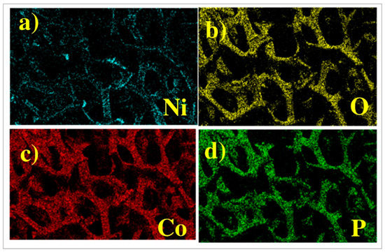 The structural details of bare nickel foam (NiF) and modified CoP@NiF were investigated using scanning electron microscopy (SEM). As illustrated (Figure 1a–c), the structure of bare nickel foam was retained while the surface became rougher in the modified CoP (Figure 1d). Low and high magnification of CoP@NiF showed the surface become dense and entirely covered by the CoP particles (Figure 1e,f). The energy-dispersive X-ray spectroscopy (EDS) elemental mapping confirmed the homogenous distribution of Co and P on NiF (Figure 2a–d).
