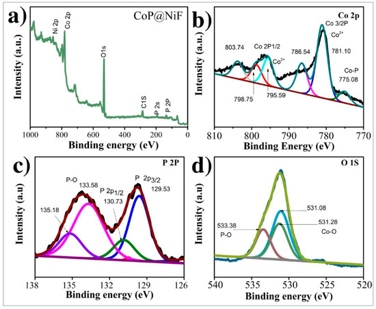 The surface chemical state of CoP@NiF is investigated using XPS. The survey spectra of CoP@NiF (Figure 3a) show that Co, P, Ni, and O elements coexist in the electrocatalyst. This was completely consistent with the EDX results. The binding energies (BEs) 781.10 (2p3/2) and 795.59 (2p5/2) eV are ascribed to the binding energies Co 2p3/2 and Co 2p1/2 in CoP, respectively whereas the BEs 779.6 and 795.1 eV are attributed to (2p3/2) and (2p5/2) [30]. Satellite peaks are the two remaining deconvoluted peaks, found at 786.54 eV and 803.74 eV. Furthermore, the high-resolution XPS spectra of P 2p core levels can be deconvolved into three peaks, respectively positioned at 129.5 eV for P 2p3/2, 130.7 eV for P 2p1/2, and 133.58 eV for oxidized P species. The phosphate is represented by a wide peak at 135.4 eV, indicating surface oxidation [31,32]. The peaks at 781.2 and 134.4 eV are attributed to oxidized Co and P species formed by the surface oxidation of CoP. It is proposed that the peaks at 780.4 eV and 133.5 eV develop as a result of the unavoidable interaction between the CoP surface and oxygen. The high-resolution C spectra of O 1s supports the findings, which can be deconvoluted into three peaks of P-O (533.2 eV), C-O (531.9 eV), and Co-O (531.3 eV).