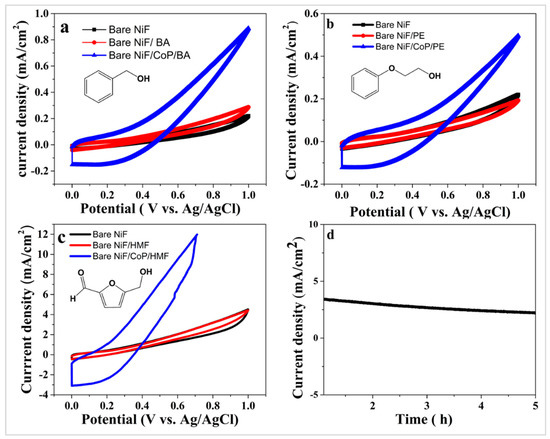 Furthermore, the addition of HMF also enhanced the current density. These findings show that the prepared CoP electrocatalyst exhibits significant catalytic activity towards the oxidation of alcohols. It is worth mentioning that the bare nickel foam showed lower current density and low capacitive current for all the substrates, as illustrated in Figure 4. Figure 3d depicts a five-hour duration chronoamperometry curve for the CoP@NiF electrode in the presence of the electrolytes. No significant changes in current density were observed for the entire period investigated, demonstrating the chemical stability of the electrocatalyst under the applied experimental conditions.