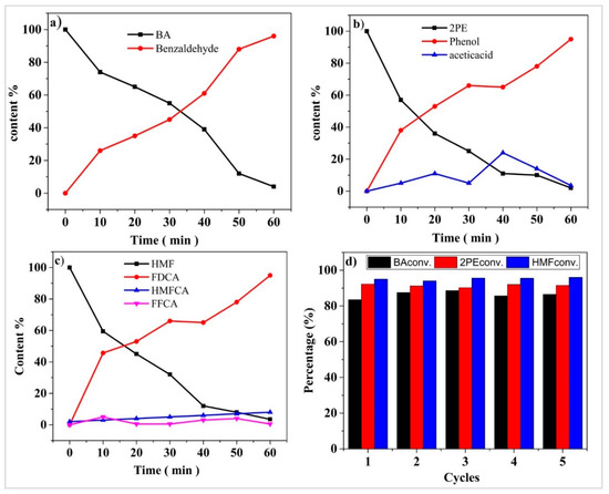 Standard solutions of reactants and products, such as benzyl alcohol, 2-phenoxyethanol, and HMF, were used to obtain the calibration curves. The alcohol concentrations and their oxidation products were determined from the peak areas. Percent (%) conversion and selectivity were calculated using the following formulas: