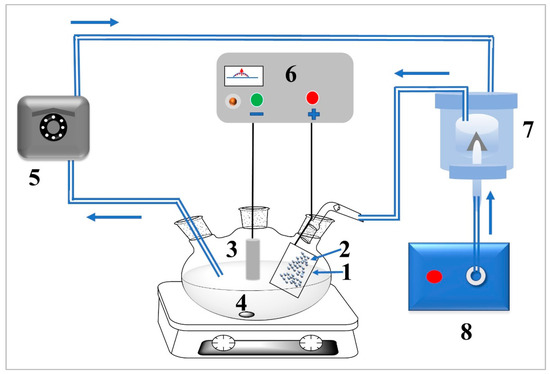 All electrochemical experiments were carried out using CH Instruments 1140A potentiostats (CH Instruments, Inc., Austin, TX, USA). An undivided electrochemical cell (EuroCell) with a 50 mL volume (working solution, 0.21 L and GSG-ME) was modified to suit a droplet-flow assisted configuration. Scheme 2 shows the schematic diagram of the droplet-assisted electrochemical flow reactor used in this work. A nickel foam was used as the anode, while the cathode was a platinum electrode and was connected to a direct current power source (Ealing High voltage power supply, 0–50 V). The electrodes were placed 1.5 cm from the reactor’s bottom and 2.0 cm apart as an inter-electrode gap. An air pump connected to the sample flow recirculatory system was used to create a nebulized mist of the sample solution directed at the anode surface.