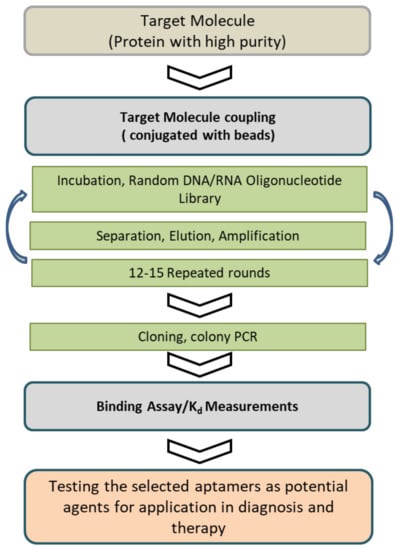 Schematic representation of the protein-based SELEX process used to select an aptamer. The conventional SELEX method is typically carried out using purified target molecules and includes incubating the target molecule. This cycle has to be performed in several rounds, and the binding affinity is monitored until significant binding affinity is reached. High-affinity aptamers for the ligands are isolated and identified by classical cloning and the sequencing results using bioinformatics analysis. The aptamer selection process is followed by selectivity study to the specific target molecule, and the thus identified molecules are used for potential diagnostic or therapeutic applications.