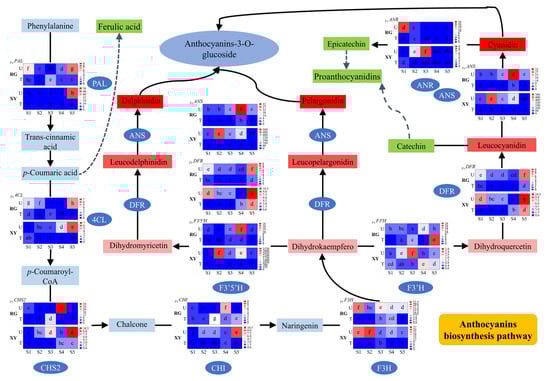 Gene expression studies on the main genes involved in the anthocyanin biosynthesis of grape berries from Turpan and Urumqi were conducted by RT-qPCR. The anthocyanin biosynthesis pathway and relative expression levels of PAL, 4CL, CHS2, CHI, F3H, F3′H, F3′5′H, DFR, ANS, and ANR genes are shown in Figure 1. The average expression rates of RG and XY grape berries’ genes were calculated as the ratio of the relative expression of these key genes at each stage and Turpan S1. PAL is the first gene for the synthesis of anthocyanins in grape berries. In general, the expression of PAL in each sample unanimously downregulated at first but followed with an upregulating trend in later stages. Overall, the expression of 4CL in Urumqi berries reached its maximum at S4, whereas it was downregulated during the development of berries in Turpan. For CHS2, a higher expression level was found at the later maturation stages. CHI had the highest relative expression level at S4 or S5. In addition to the RG−U grapes, CHI continued to be upregulated during grape development. Moreover, the expression of F3H was slightly upregulated in the middle development stage and presented a downregulation after grape maturation. The relative expression of F3′H and F3′5′H both presented fluctuating trends. As for DFR, the expression level reached its first peak at S5 and its second peak at S1. The expression of ANS was upregulated with the development of berries until it was downregulated at S5. Even if there was a slight upregulation of ANR in the early stages, the expression of ANR was still significantly decreased at the later maturation stages.