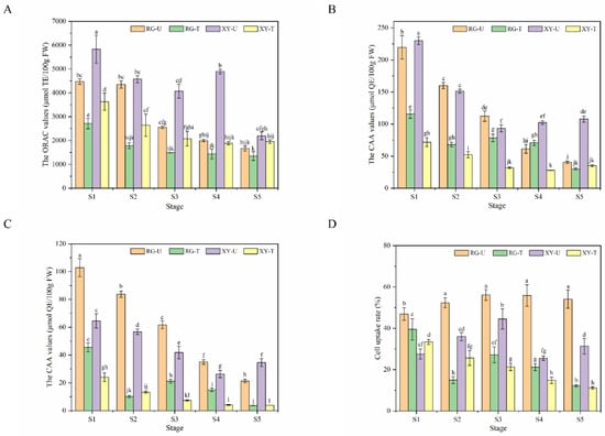 Antioxidant activities of grape berries in ORAC values and CAA values during the five developmental stages in Urumqi and Turpan. (A) ORAC values; (B) CAA values under no PBS wash protocol; (C) CAA values under the PBS wash protocol; (D) cell uptake rate. Bars with different letters differ significantly at p < 0.05. RG−U, Urumqi ‘Red Globe’ grapes; RG−T, Turpan ‘Red Globe’ grapes; XY−U, Urumqi ‘Xin Yin’ grapes; XY−T, Turpan ‘Xin Yu’ grapes.
