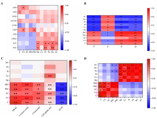A Pearson’s correlation analysis of the components in grape berries and the key genes of their synthetic pathways are shown in Figure 3A. The transcript levels of F3H, F3′5′H, ANS, and ANR exhibited positive correlations with phenolics, whereas most relative expressions of genes showed obvious positive correlations with anthocyanins. PAL and 4CL were speculated to be the main genes regulating grape berries’ anthocyanin synthesis, since they were significantly related to most anthocyanin components, which would be more sensitive with environmental stresses, particularly growth temperature during berry ripening. The Pearson’s correlation analysis of grape berry components and color difference are shown in Figure 3B. Moreover, significant positive correlations were observed between anthocyanins and a* values, whereas anthocyanin contents were significantly negatively associated with L* and b*. It was also verified that anthocyanins were the important coloring substances for the red color of grape berries. The Pearson’s correlation analysis of the phenolic components and activities of grape berries is shown in Figure 3C. The CAA values with PBS wash protocol, the CAA values with no PBS wash protocol, and ORAC values exhibited significant positive correlations with phenolic compounds, although there was no obvious correlation between their values and anthocyanins. The cell uptake rate and antiproliferative activity were positively correlated with phenolics, including anthocyanins. The Pearson’s correlation analysis between grape berry components is shown in Figure 3D. There were strong correlations among phenolics. Moreover, anthocyanins were correlated with each other. Viewing the relationships of total anthocyanins (AC), procyanidin B1 and B2 were negatively related with AC, whereas all kinds of anthocyanins were simultaneously highly correlated with AC.