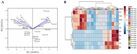 Principal component analysis (A) and cluster analysis (B) in grape berries during the five developmental stages in Urumqi and Turpan. RG−U, Urumqi ‘Red Globe’ grapes; RG−T, Turpan ‘Red Globe’ grapes; XY−U, Urumqi ‘Xin Yin’ grapes; XY−T, Turpan ‘Xin Yu’ grapes. RG−US1, RG−US2, RG−US3, RG−US4, RG−US5, XY−US1, XY−US2, XY−US3, XY−US4, RG−US5, RG−TS1, RG−TS2, RG−TS3, RG−TS4, RG−TS5, XY−TS1, XY−TS2, XY−TS3, XY−TS4, and RG−TS5 stand for grape berry samples. C, FA, EC, PB1, PB2, Dp, Cy, Pt, Pn, and Mv stand for catechin, ferulic acid, epicatechin, procyanidin B1, procyanidin B2, delphinidin-3-O-glucoside, cyanidin-3-O-glucoside, petunidin-3-O-glucoside, peonidin-3-O-glucoside, and malvidin-3-O-glucoside, respectively.