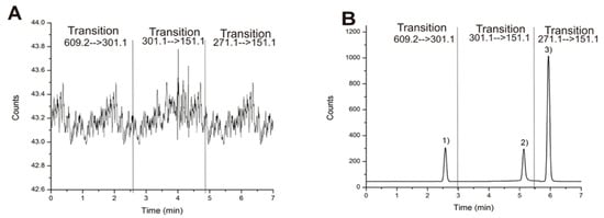 (A) Blank plasma matrix chromatogram and (B) spiked sample chromatogram at 10 ng/mL b calculated by multiple reaction monitoring with each transition. (1) hesperidin, (2) quercetin, and (3) naringenin.