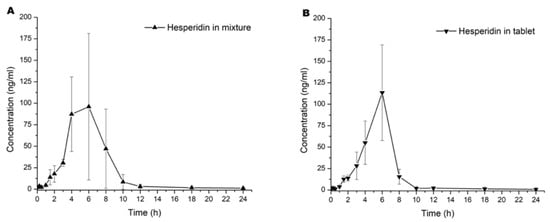 In the current study, we observed that the first detectable concentration of the first sample was at 5 min. These results were associated with the absorption and elimination equations; the literature described hesperidin and naringenin found between 5 and 15 min after oral administration [14,15]. Finally, concentrations lower than 3 ng/mL were detected at 24 h after administration. This effect was reported by Chen et al. [16], which they described as a enterohepatic recirculation phenomena before final elimination.