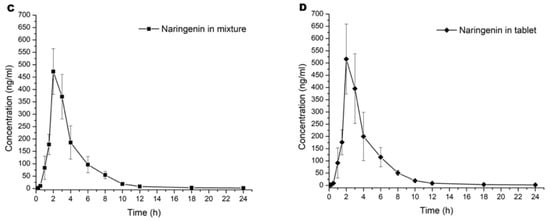 Pharmacokinetic curves of the serum mean concentration versus time of (A) hesperidin in mixture, (B) hesperidin in tablet, (C) naringenin in mixture, and (D) naringenin in tablet. Values are expressed in mean ± SD.
