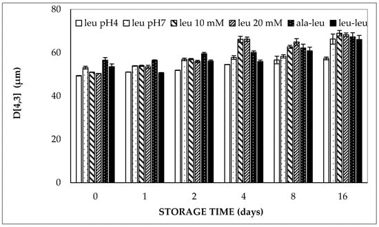 Volume-weighted average droplet diameter (D[4,3]) of double emulsions containing either 5 mmol/L (at pH 4.0 or pH 7.0), 10 mmol/L or 20 mmol/L L-leucine, 5 mmol/L alanine–leucine or 5 mmol/L leucine–leucine (all at pH 7.0) prepared with HOSO upon storage at 37 °C.