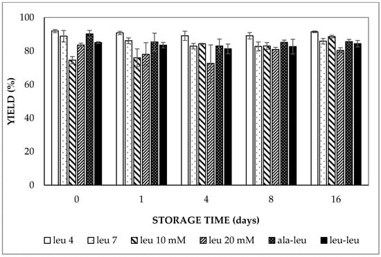 Yield of entrapped water in double emulsions containing either 5 mmol/L (at pH 4.0 or pH 7.0), 10 mmol/L or 20 mmol/L L-leucine, 5 mmol/L alanine–leucine or 5 mmol/L leucine–leucine (all at pH 7) prepared with HOSO upon storage at 37 °C.