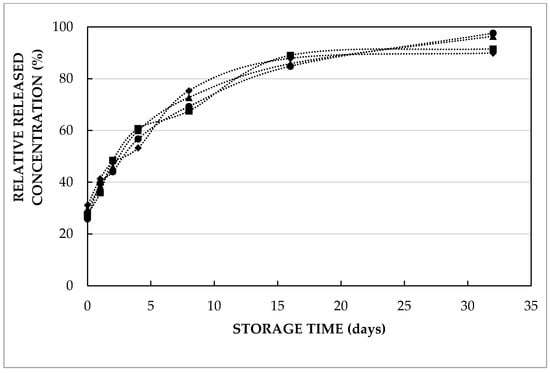 According to the solution–diffusion transport model, the release kinetics of entrapped hydrophilic compounds in double emulsions depend on both the solute solubility and diffusivity in the oil phase. For the hydrophobicity effect, the compounds with higher hydrophobicity will be more soluble in the oil phase, and thus they will release faster. Considering the data of Figure 5, it is clear that the solubility effect largely overrules the diffusivity as the release kinetics are proportional to the molecular weight, i.e., slower for smaller molecules, whereas the opposite effect should be observed if diffusivity played an important role.