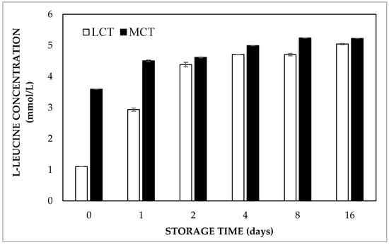 In order to investigate the oil phase composition effect, LCT and MCT oil were used in double emulsions. It was noted that the L-leucine concentration in the external aqueous phase directly after preparation was almost 3.60 mmol/L in double emulsions prepared with MCT oil, whereas it was only about 1 mmol/L for LCT containing samples (Figure 4). Moreover, the equilibrium concentration was observed within 4 days of storage for the double emulsions prepared with MCT oil, while it took about 16 days for the samples containing LCT oil. As the entrapped water volume fraction of the double emulsions containing HOSO or MCT oil was found to be 91.8% and 92.9% just after preparation, respectively, it is clear that L-leucine release did not occur via breakdown of the internal water droplets. The faster release of L-leucine was likely due to the fact that MCT oil is more hydrophilic than LCT, as reflected by the solubility of water in the oils, which is more than two times higher in MCT as compared to LCT [21]. Hence, faster transport of L-leucine through the oil phase occurred due to the higher solubility of the solute. In addition, MCT oil also has a lower viscosity, which gives rise to a higher diffusivity of dissolved solutes, and hence may also speed up molecular transport. With respect to the oil phase composition, it was also observed that highly hydrophobic mineral oil induced a slower release of peptides during gastric digestion compared to butter oil and linseed oil [22]. This was explained by the higher interfacial tension and viscosity that mineral oil provided to the double emulsions.